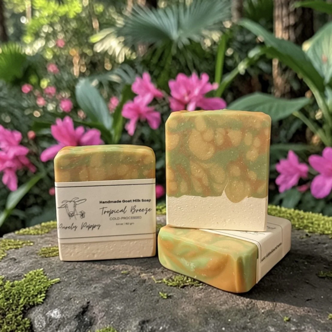 Escape to warm island air with Tropical Breeze, a refreshing goat milk and tallow soap inspired by sun-soaked gardens and gentle ocean winds. Swirls of soft green and golden peach create a tropical landscape in every bar, while rich farm-fresh goat milk produces a creamy, skin-loving lather.